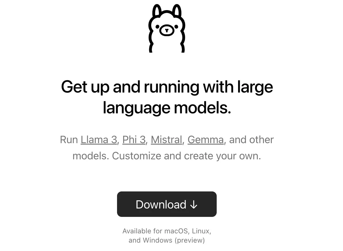 在官网首页,我们可以直接下载Ollama安装程序(支持 Windows/MacOS/Linux):https://ollama.com/