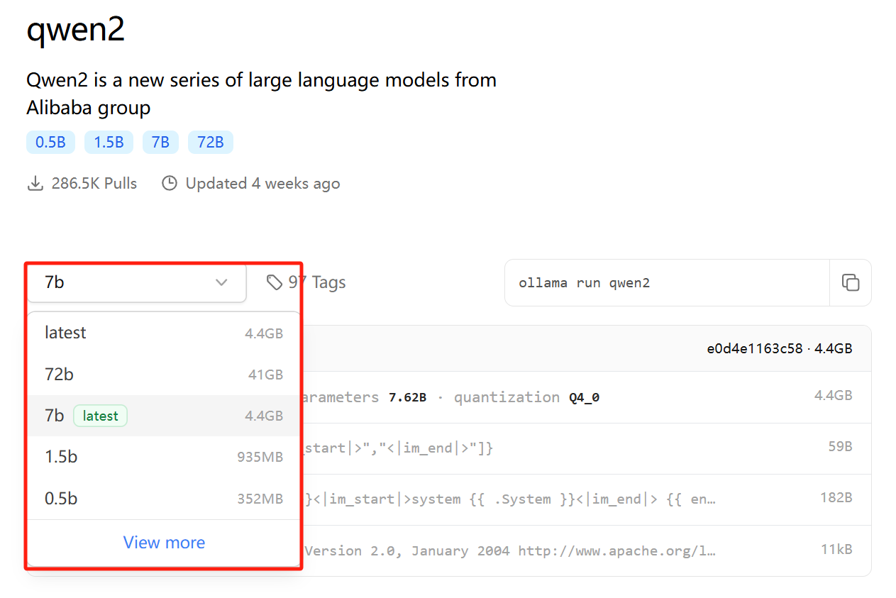 则代表为默认参数规格,下载时可以不用指定,如Qwen2的7b被标记为latest